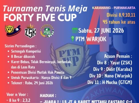 Karawang, otentiknews.click – Guna mempererat tali silaturahmi antar pecinta olahraga tenis meja, Persatuan Tenis Meja (PTM) Warjok Karawang bersiap menyelenggarakan turnamen bergengsi bertajuk “Forty Five (45) Cup”. Ajang ini dijadwalkan akan berlangsung pada Sabtu, 27 Juni 2026, bertempat di markas PTM Warjok.