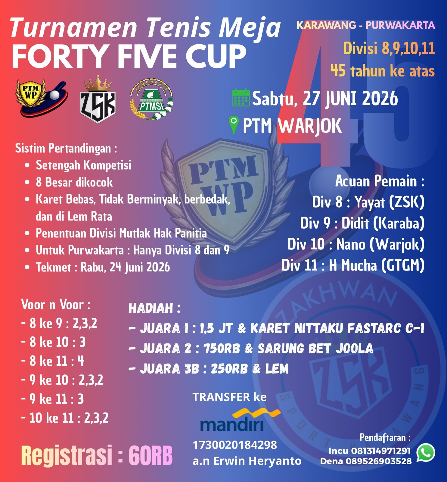 “Turnamen Tenis Meja PTM Warjok ‘Forty Five Cup’ ini merupakan bentuk dedikasi kami untuk menghidupkan semangat olahraga, khususnya bagi kelompok usia 45 tahun ke atas. Kami ingin ajang ini menjadi tempat berkumpul dan beradu teknik secara sportif,” ujar Kang Wawa.Â
