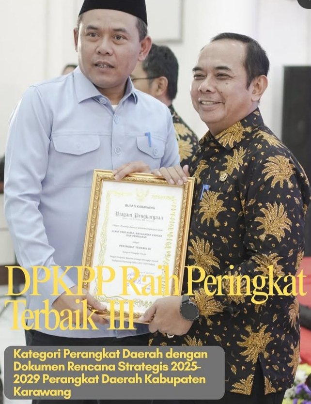 Penghargaan tersebut diberikan Bupati Karawang H. Aep.Syaepuloh,SE dan simbolik diserahkan oleh Ketua DPRD Karawang H. Endang Sodikin, S.Pd., I., SH., MH., kepada Kadis DPKPP Drs. Rochman, M.S., sebagai bentuk apresiasi atas kualitas penyusunan dokumen perencanaan strategis yang dinilai komprehensif, terukur, dan selaras dengan arah pembangunan daerah.