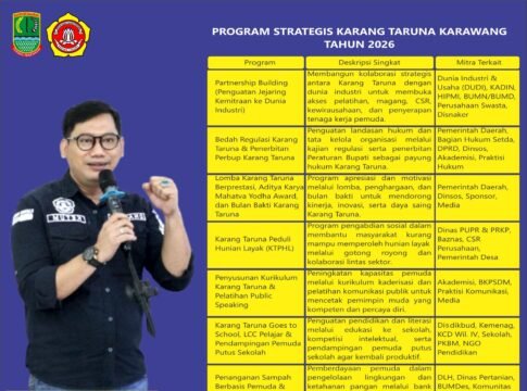 Karawang, otentiknews.click – Karang Taruna Kabupaten Karawang secara resmi menetapkan 9 Program Strategis Tahun 2026 sebagai arah kebijakan organisasi dalam memperkuat peran pemuda serta meningkatkan kualitas sumber daya manusia di Kabupaten Karawang.