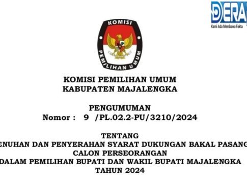 MAJALENGKA | Deraphukum.click | Berdasarkan Peraturan Komisi Pemilihan umum Nomor : 2 Tahun 2024 tentang Tahapan dan Jadwal Pemilihan Gubernur dan Wakil Gubernur, Bupati dan Wakil Bupati, Serta Walikota dan Wakil Walikota Tahun 2024, dan Keputusan Komisi Pemilihan Umum Kabupaten Majalengka Nomor : 1112 Tahun 2024 tentang Syarat Minimal Dan Persebaran Dukungan Bakal Calon Perseorangan Dalam Pemilihan Bupati dan Wakil Bupati Majalengka Tahun 2024, dengan ini diumumkan kepada seluruh warga masyarakat yang akan mencalonkan diri dalam Pemilihan Bupati dan Wakil Bupati Majalengka Tahun 2024 melalui jalur perseorangan untuk dapat melengkapi dan menyerahkan persyaratan dukungan dengan ketentuan sebagai berikut :