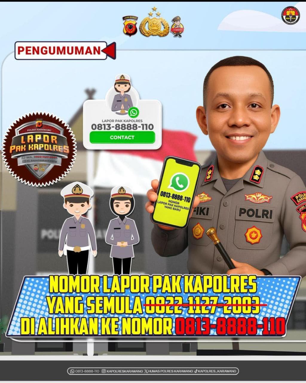 “Kami memberikan pelayanan pengaduan Lapor Pengaduan dengan nomor WA baru 0813 8888 110 (sudah aktif). Namun, untuk masa transisi, nomor yang lama 0822 1127 2003 tetap bisa digunakan sampai 15 Desember 2025. Setelah tanggal tersebut, nomor lama akan dinonaktifkan,” kata Sie Humas Polres Karawang Cep Wildan.