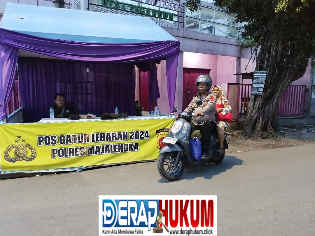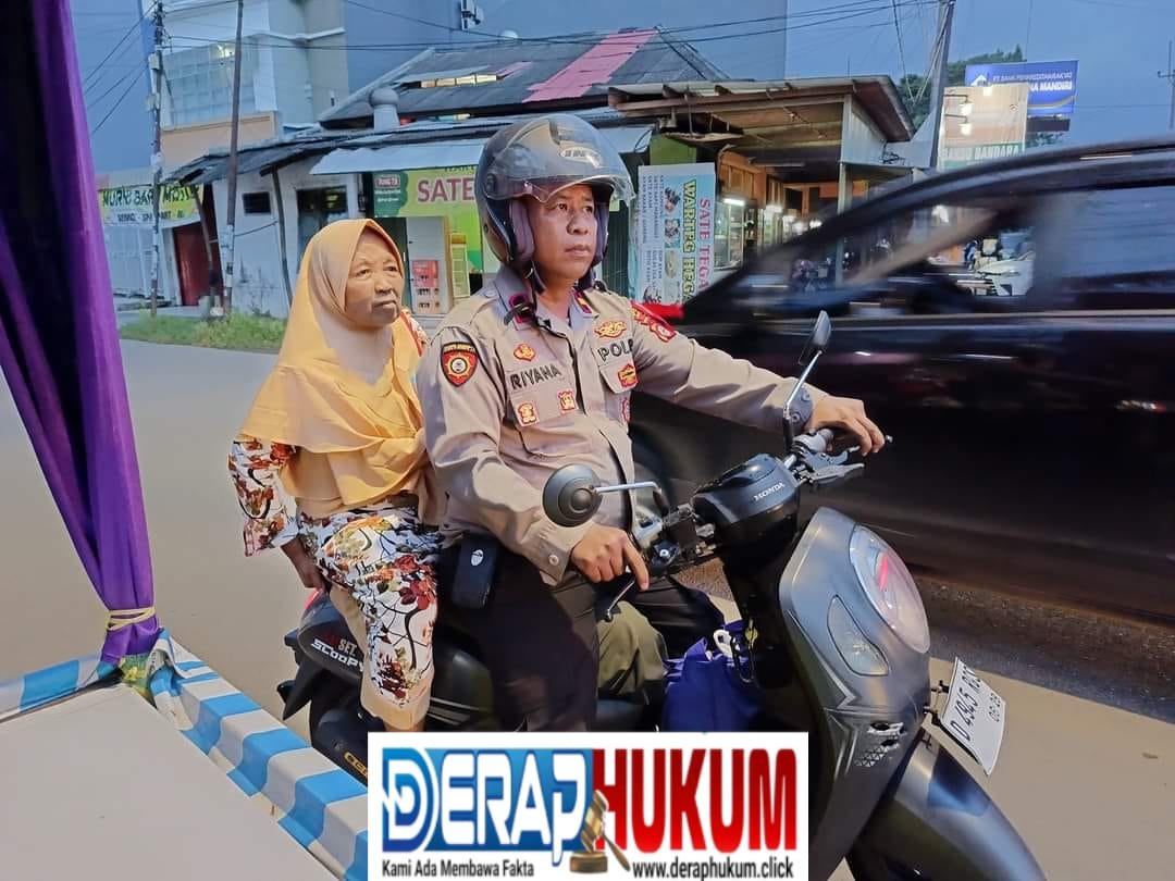 MAJALENGKA | Deraphukum.click | Polisi sebagai pengayom dan pelayan masyarakat ditunjukkan oleh seorang Perwira Polres Majalengka IPDA Riyana yang sedang bertugas di Pos Gatur Lebaran Polres Majalengka mengantarkan Seorang wanita lanjut usia (lansia) yang tersesat dan diantarkan ke rumah saudaranya, Minggu (14/4/2024).